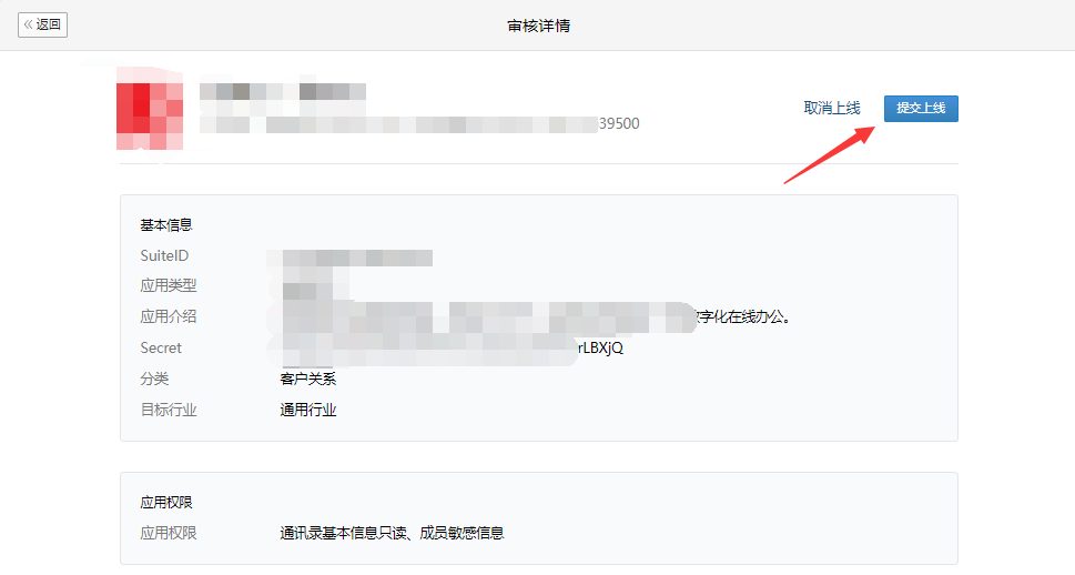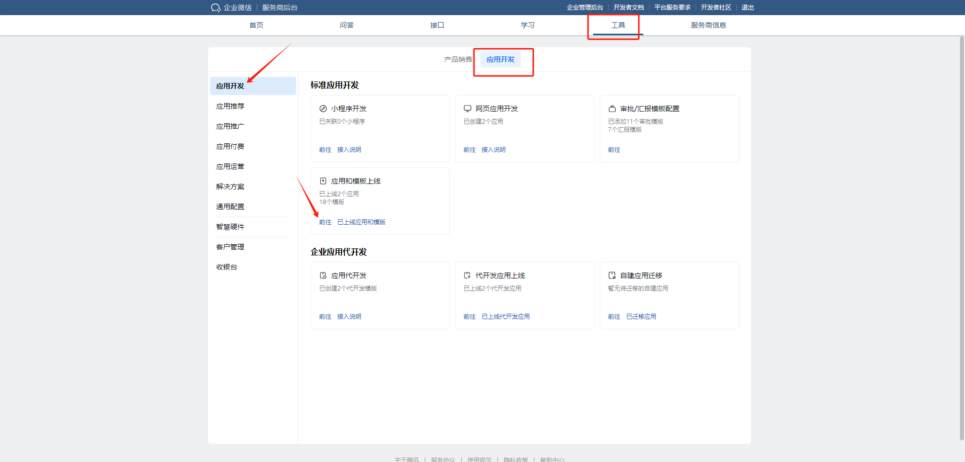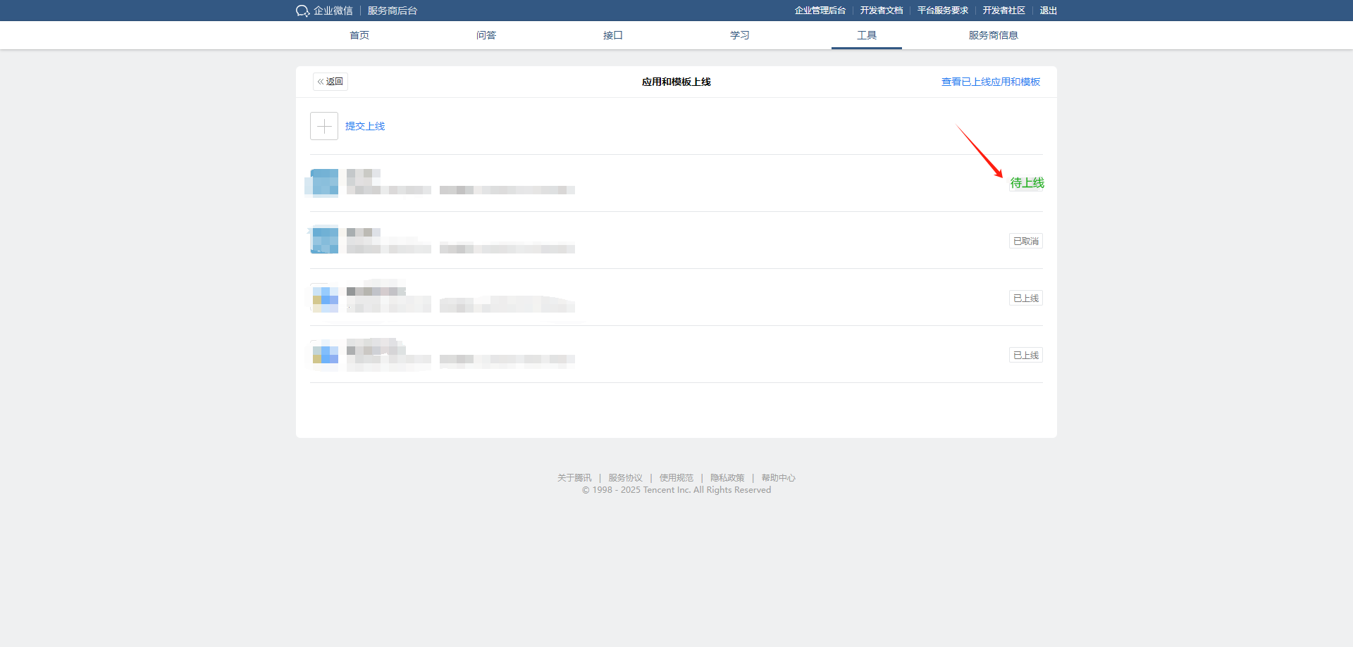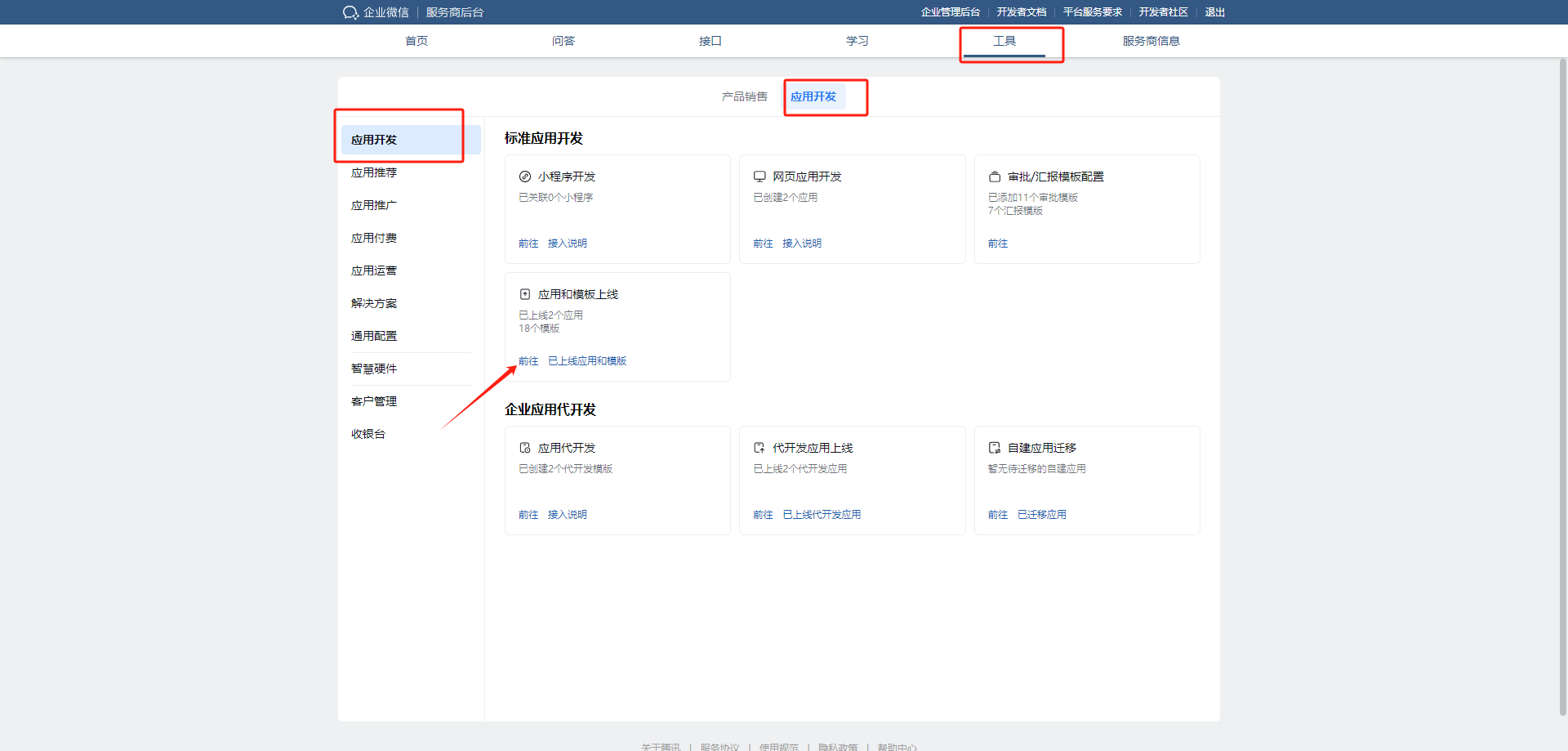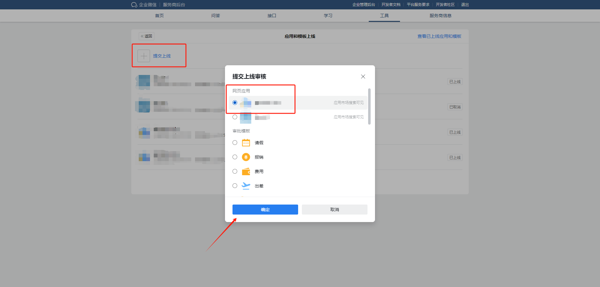 进入【工具】->【应用开发】->【应用开发】->【应用和模板上线】,点击提交上线按钮,耐心等待审核。 提交成功后,等待企业微信审核(约1~2天)。