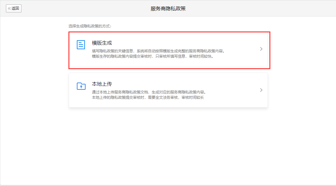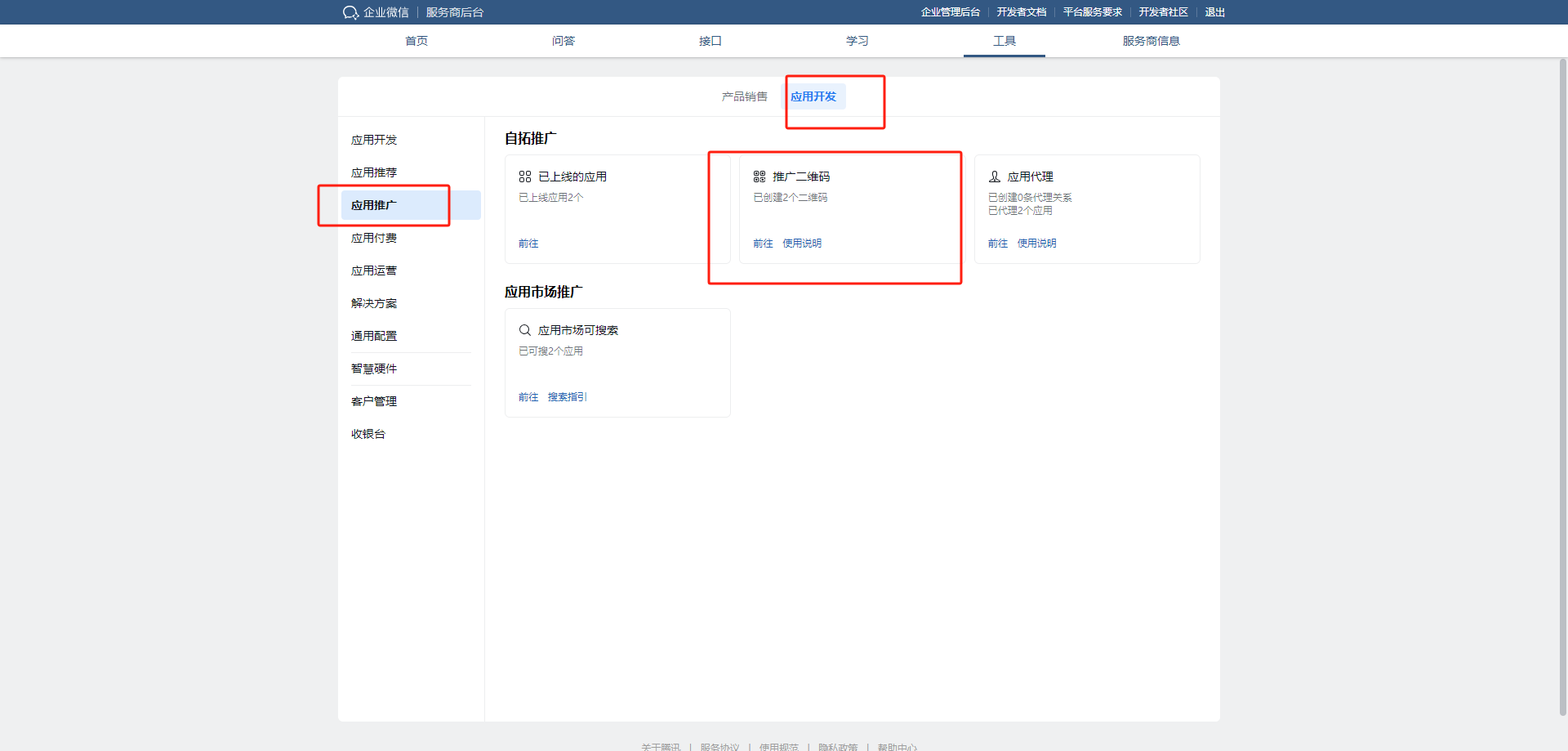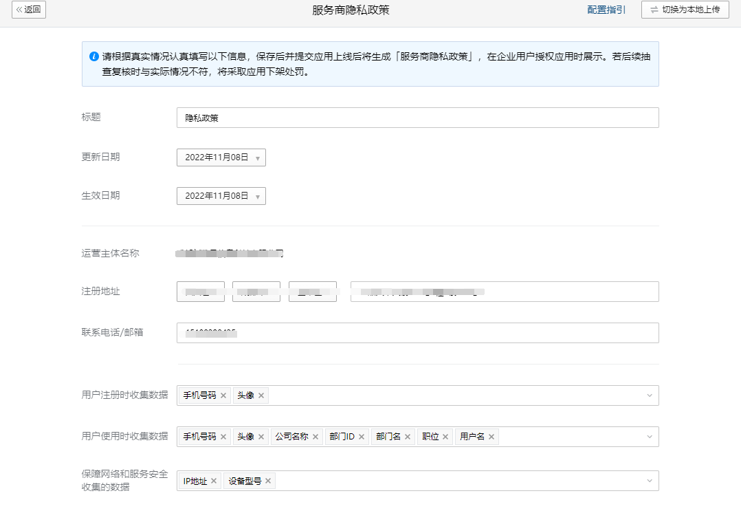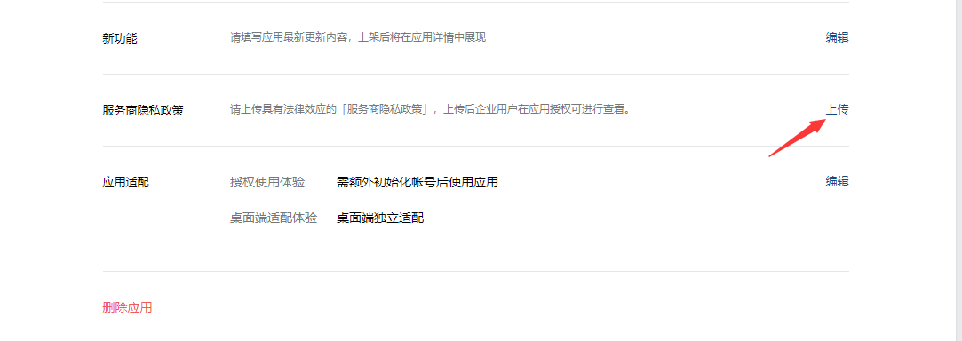 【应用开发】->【网页应用开发】,进入新添加的应用,找到服务商隐私政策,点击上传