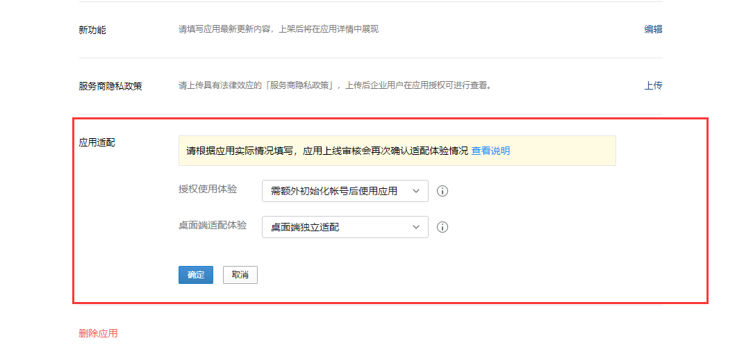 【应用开发】->【网页应用开发】,进入新添加的应用,找到应用适配,进行设置