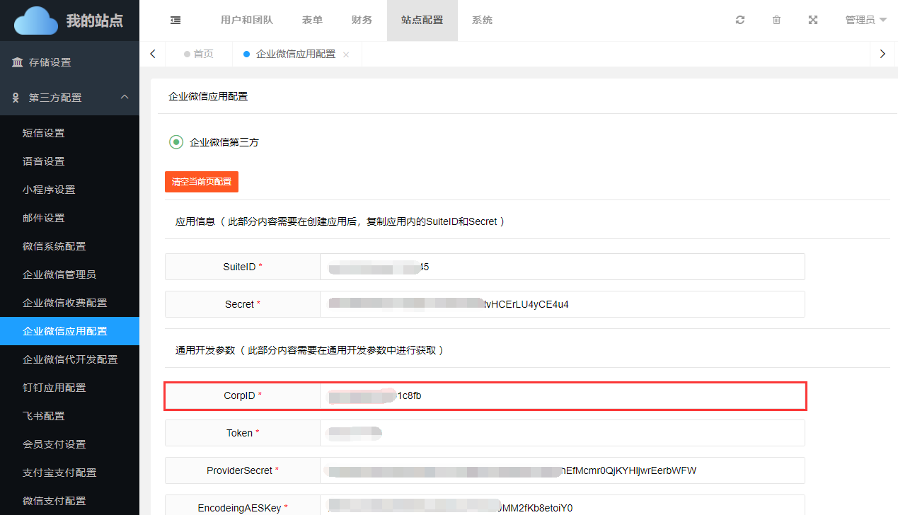 登陆企业微信服务商后台,复制这里的CorpID到后台CPORP_ID中