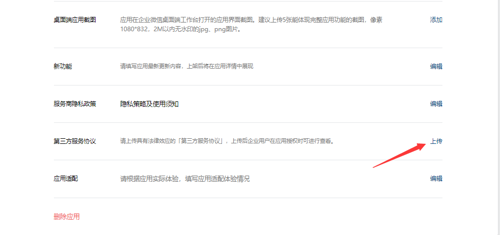 【应用开发】->【网页应用开发】,进入新添加的应用,找到第三方服务协议,点击上传(协议可下载企业微信提供的模板进行修改)