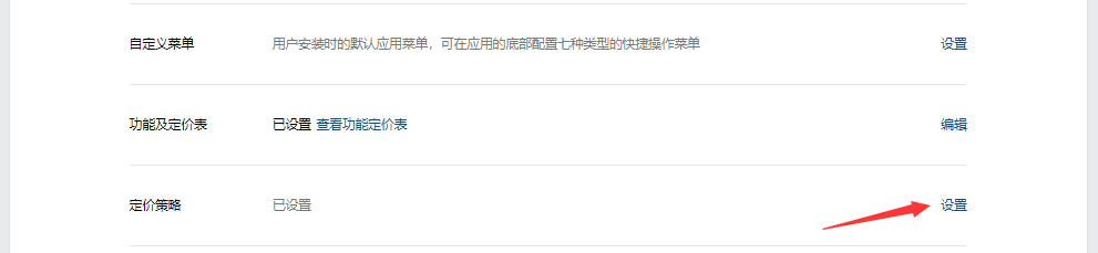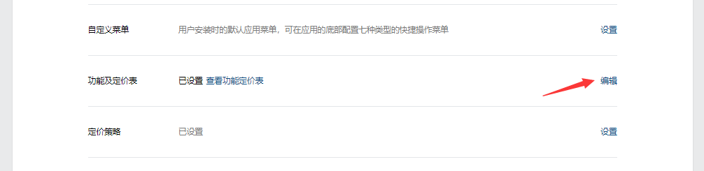 【应用开发】->【网页应用开发】,进入新添加的应用,找到定价策略,进行设置(可添加设置为免费版、会员版等,具体按自己公司收费标准进行调整)