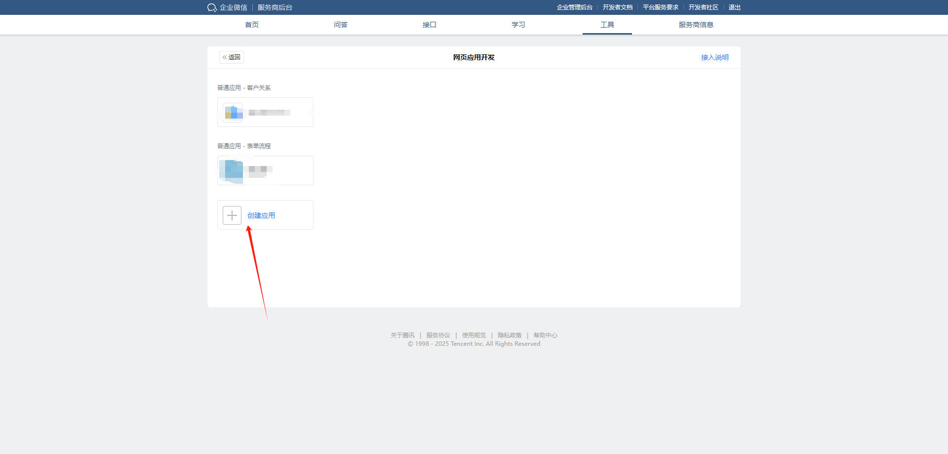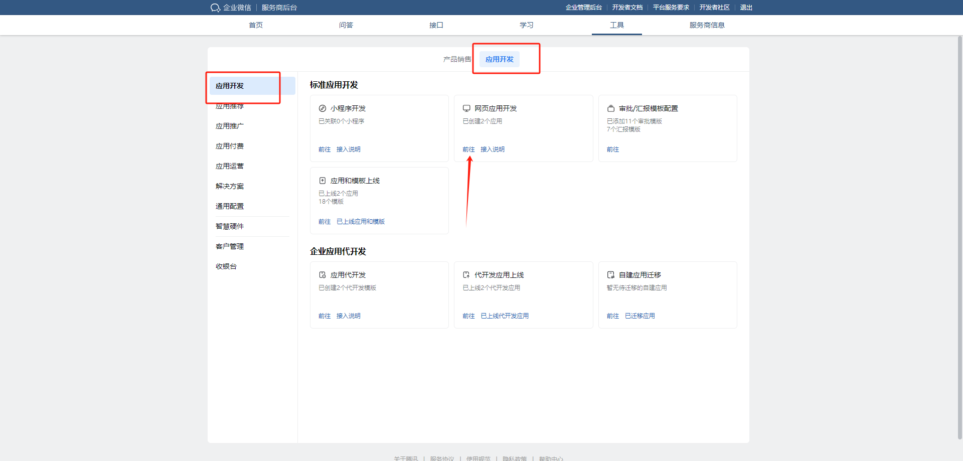 在【工具】页面点击【应用开发】->【应用开发】->【网页应用开发】->【创建应用】