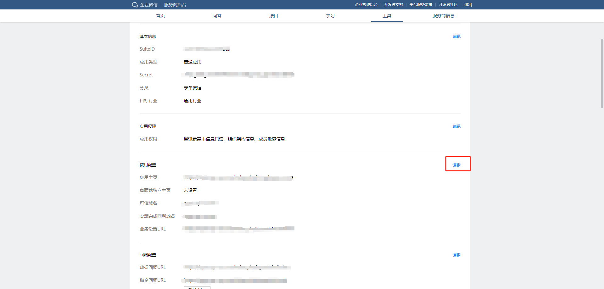 1、打开新创建的应用,找到使用配置,点击后面的编辑