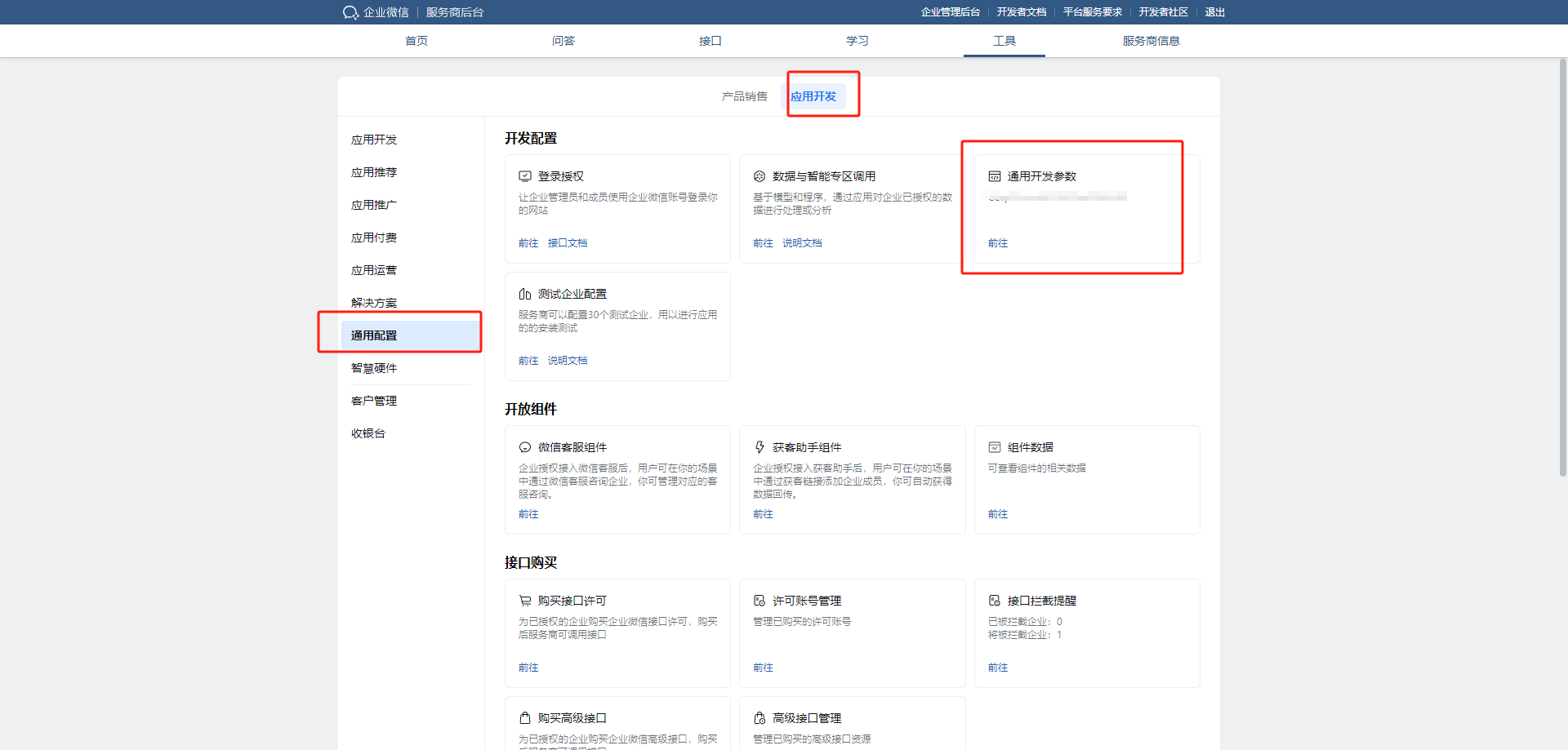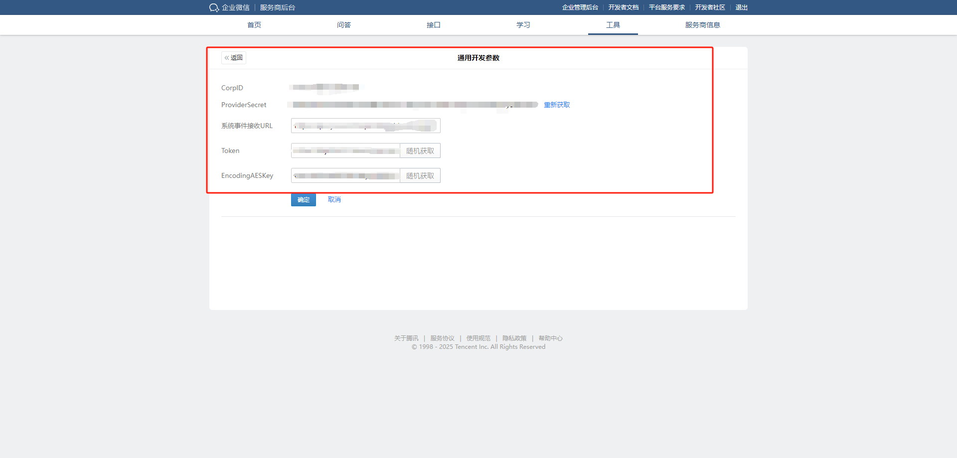 返回并点击通用开发参数,将第5步中的Token 和 EncodeingAESKey填写到相应的输入框内。