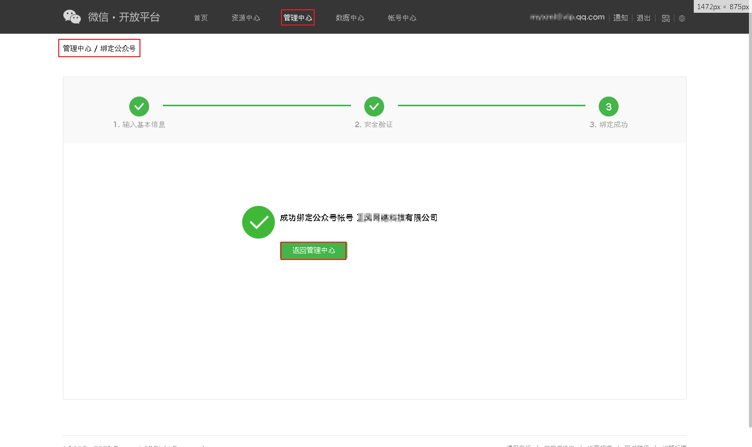 首先需要在微信开放平台登录后,进入管理中心->公众账号->绑定公众号->填写公众号账号密码->扫码验权