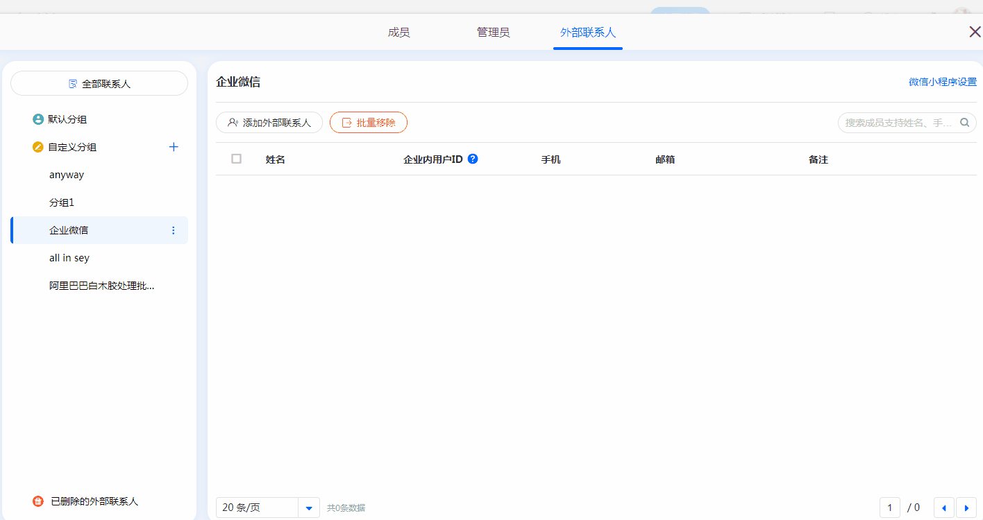 支持对当前分组内的外部联系人,按姓名、手机、邮箱进行模糊搜索。
