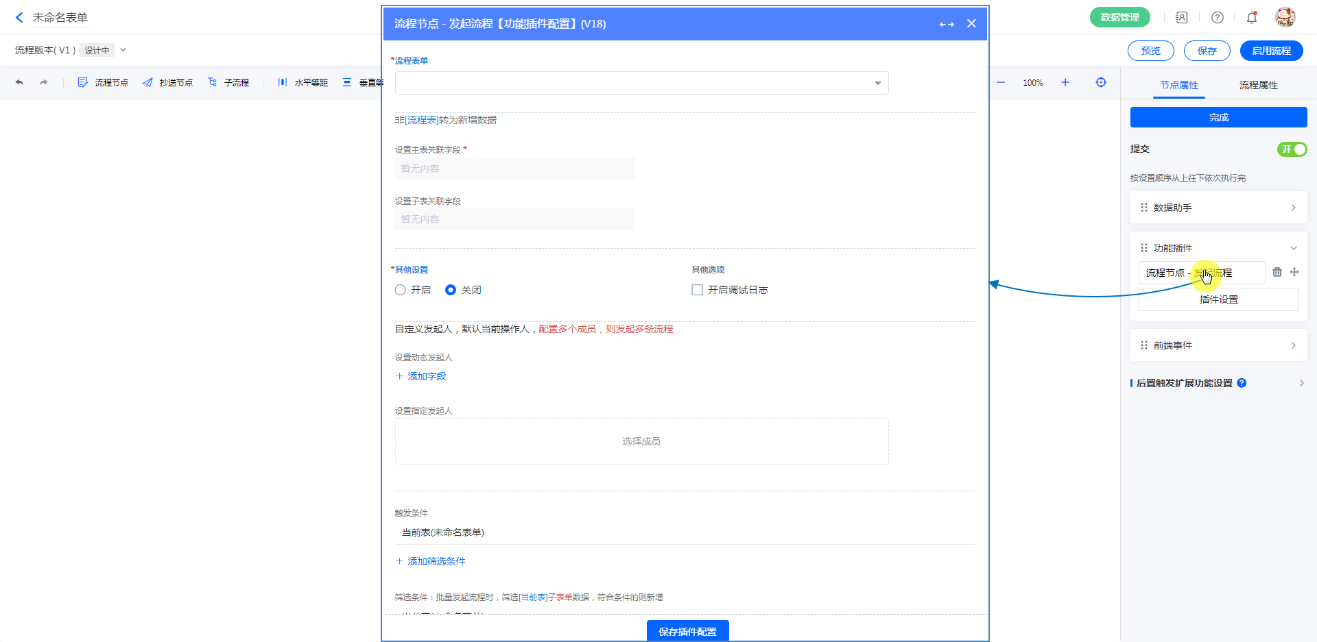完成配置之后需要进行功能插件触发方式设置,对于流程功能插件目前提供两种触发方式:前置触发与后置触发,