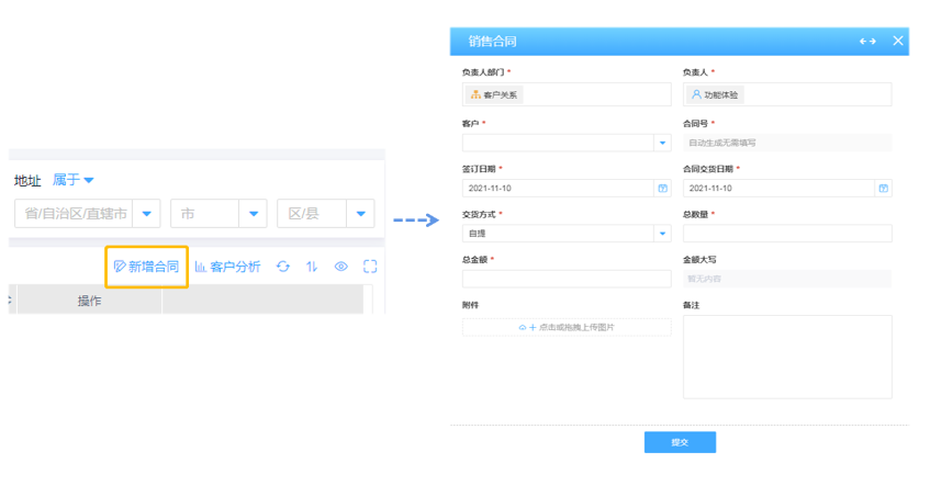 以销售合同管理为例,在数据表中包含了所有合作销售人员的合同信息以及销售情况。一般情况下,如果需要新增或者更改某一销售人员的合同信息,我们需要进入单独的合同表单中进行编辑处理,再导入到总数据表中。 而有了自定义菜单后,直接点击右上角的【新增合同】,即可进入销售合同的编辑页面,根据要求录入合同信息,点击提交就能在总表中生成新的客户合同数据。