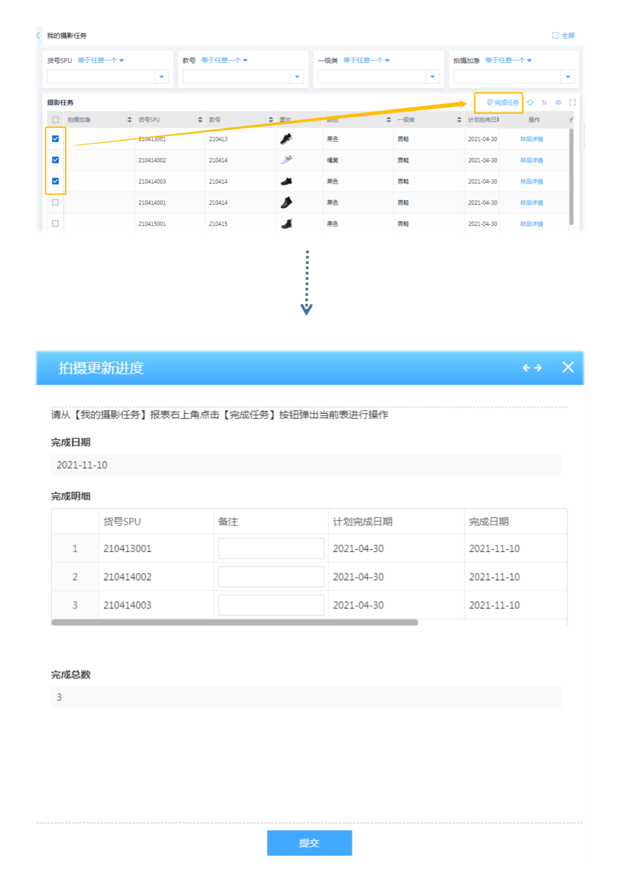 许多电商企业的商品管理环节,设计流程部署是非常重要的一环,以设计流程当中的任务管理为例,在任务池中有分配到的各项任务详情信息。 一般来说,已经完成的任务需要切换到任务拍摄进度表中进行数据录入再提交,任务多的时候这样的操作是很耗费时间的。