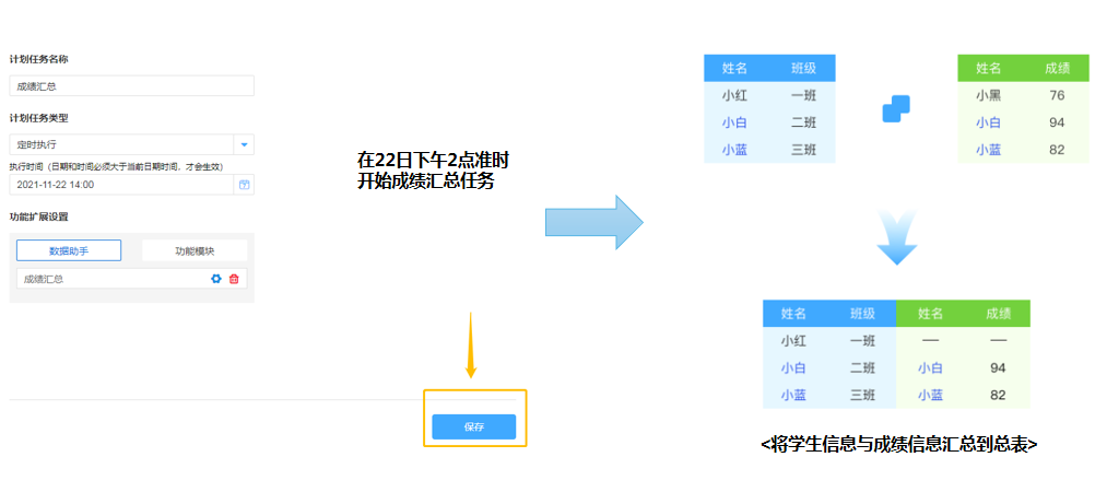 以家校管理中的学生成绩汇总为例,学生每个学期不同类型考试的成绩汇总,需要操作大量的数据表单,在饰配汇通过计划任务功能配合数据助手,能够有效为老师减负。
