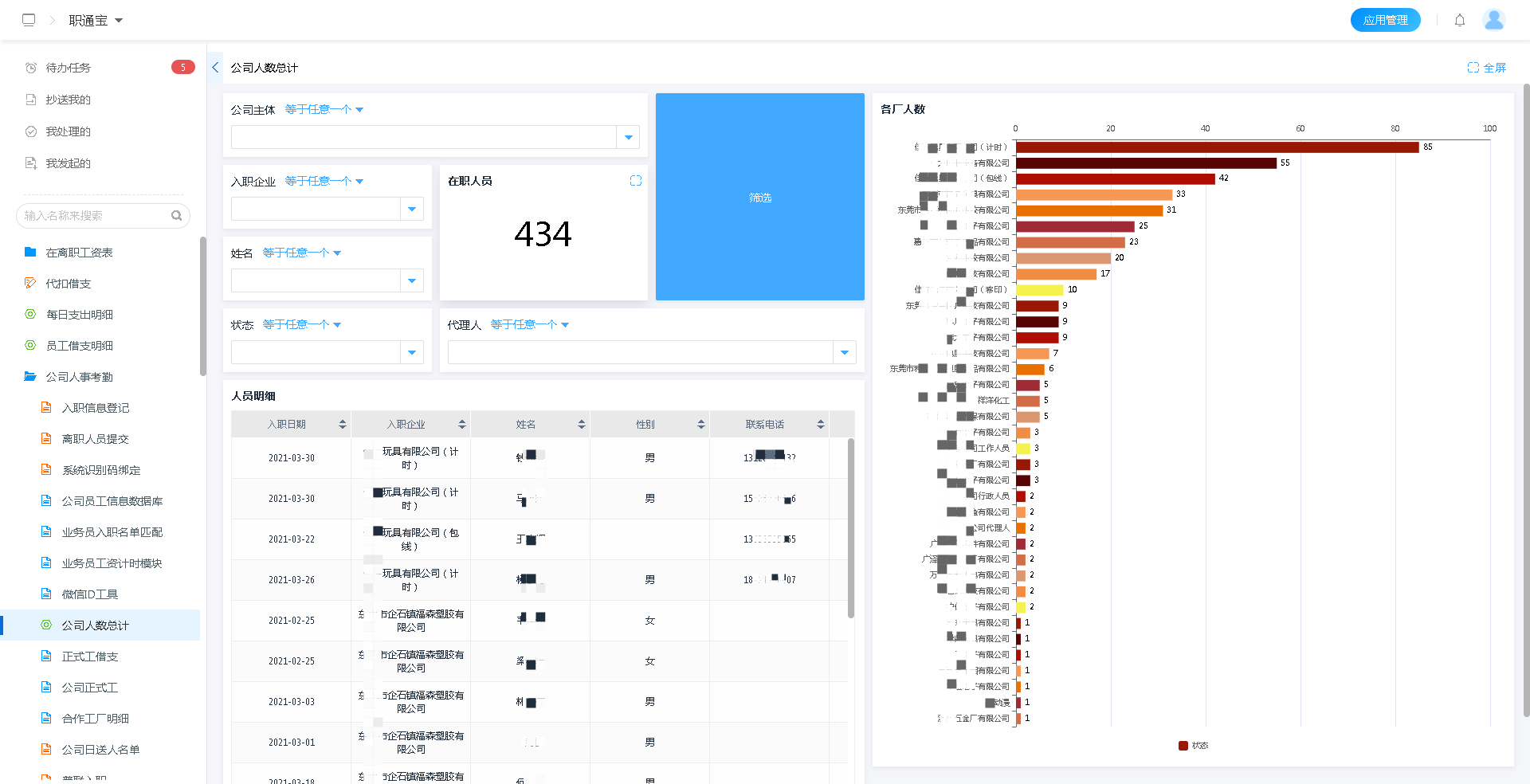 3、利用饰配汇的报表体系,实时统计所辖企业的在职人员、离职人员、人员入职渠道以及各种与人事相关费用的申报、使用、管理情况。所有款项收支,无论是明细还是汇总分析,借助多样化报表展示一目了然。