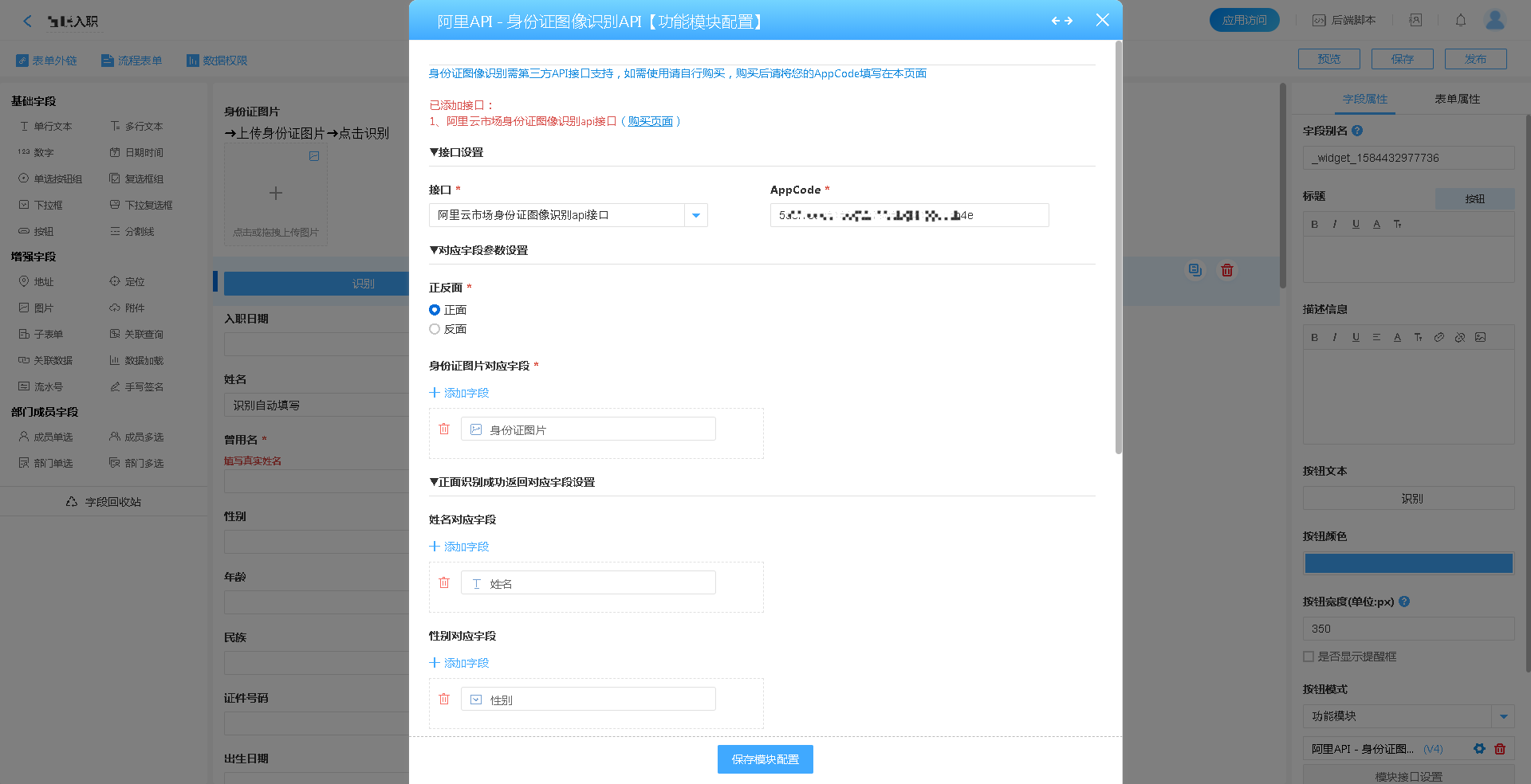 1、利用饰配汇对接外部API的能力,全自动识别入职员工的身份信息,减少繁琐的个人信息输入步骤,大大提升了人事办事效率。