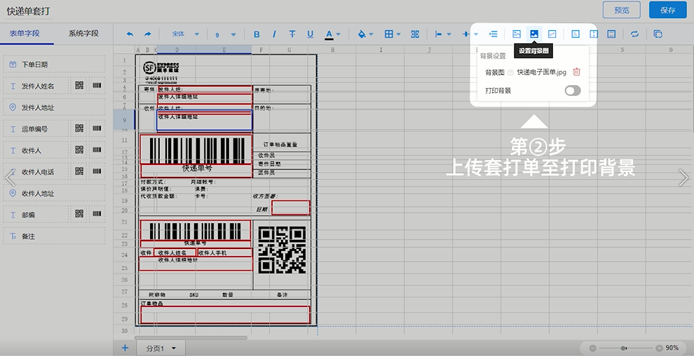 打印过程已经有了一张带有样式的打印纸张,需要把填写的数据放至对应的空白位置处打印出来,可以使用背景图可以实现套打功能,如:快递单、申请单等特定场景的打印。