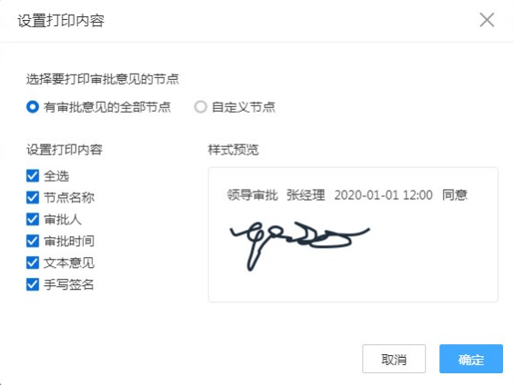 日常工作中常常需要把一些审批的记录打印成纸质文件保存下来,为了方便打印需要的审批记录,可以在设置打印内容中选择有审批意见的全部节点或自定义节点。