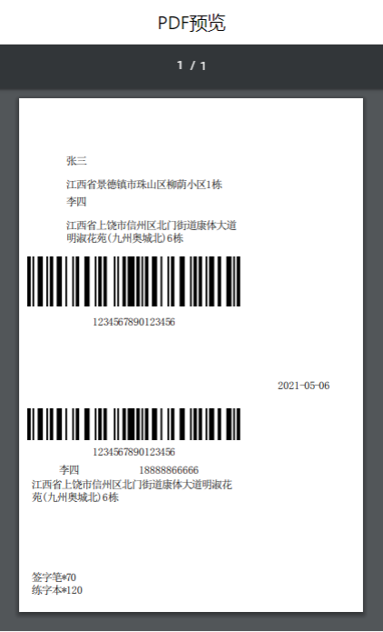 通过编辑好的自定义打印模板进行打印,可以看到打印的二维码或条形码: