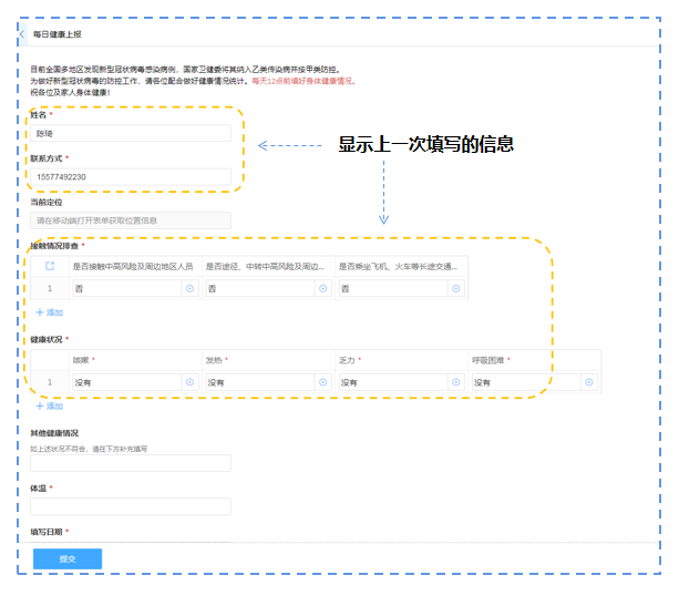 设置完成后,点击保存,我们回到应用界面,在输入基本信息后我们选择提交,页面显示提交成功后,我们选择继续添加,回到表单界面将自动显示上一条提交的内容,例如姓名、联系方式、健康状况、接触情况等等。
