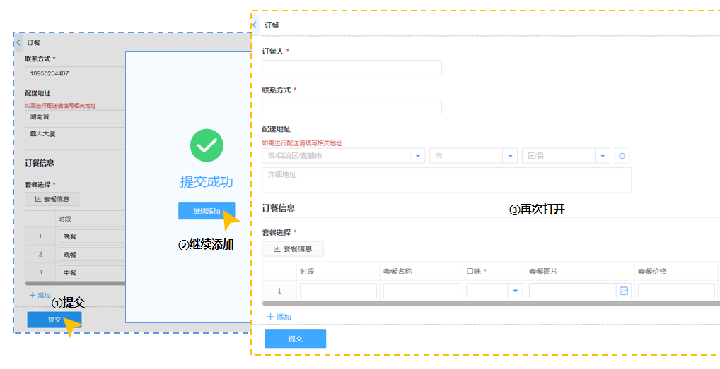 在订餐表单中我们设置提交缓存,订餐的信息录入后,如果因为紧急情况没有提交,页面内容会一直保留,选择提交后,表单就会恢复默认空白页。