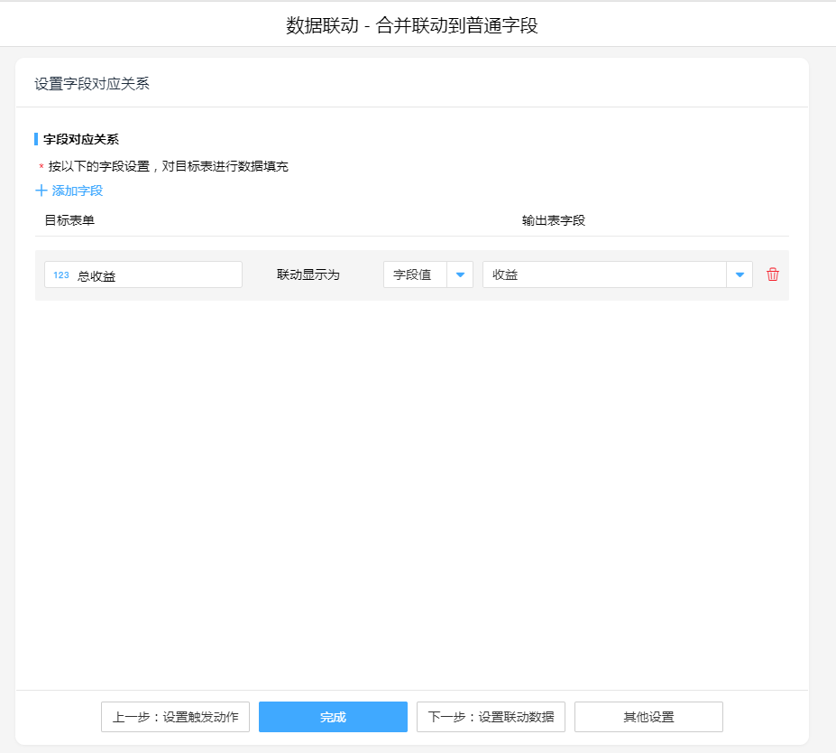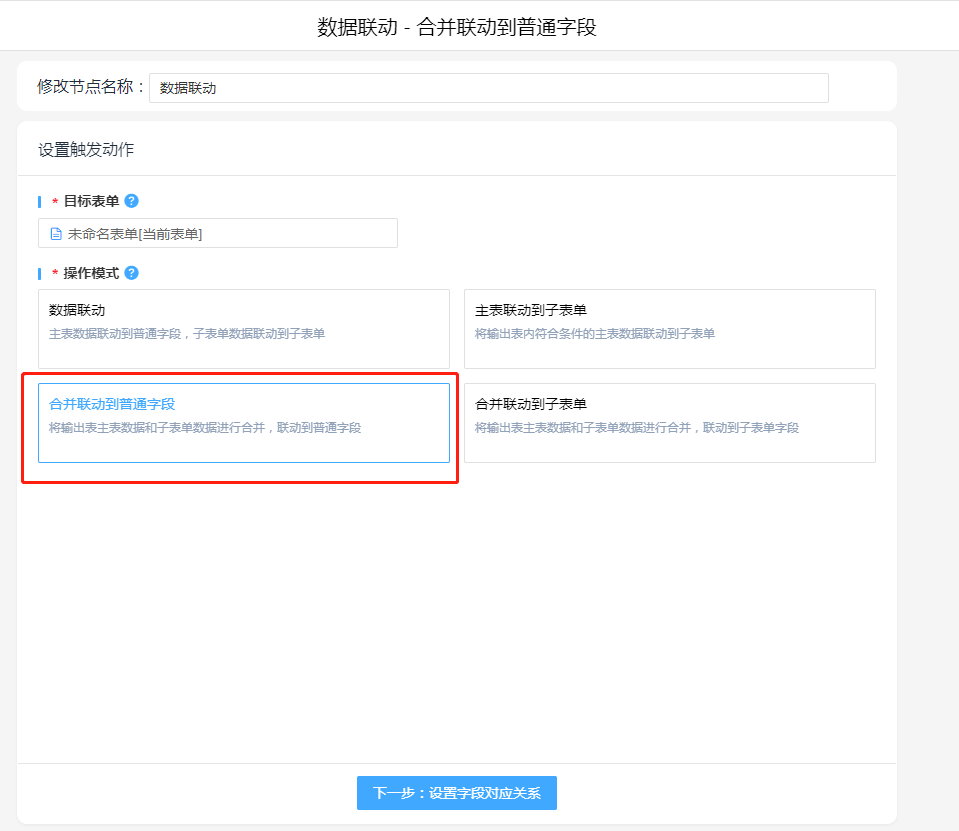 5.添加执行动作数据联动,选择操作模式合并联动到普通字段,并将字段与计算结果进行对应。