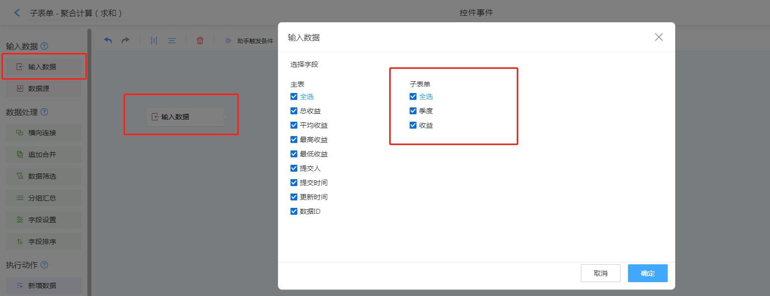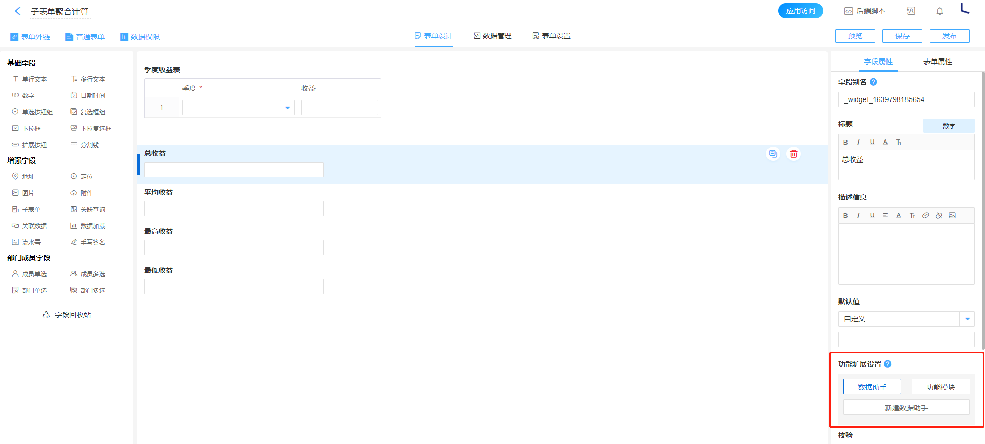通过对控件进行数据助手配置,实现利用数据助手计算当前输入页面子表单字段的总和、平均值、最大值、最小值。