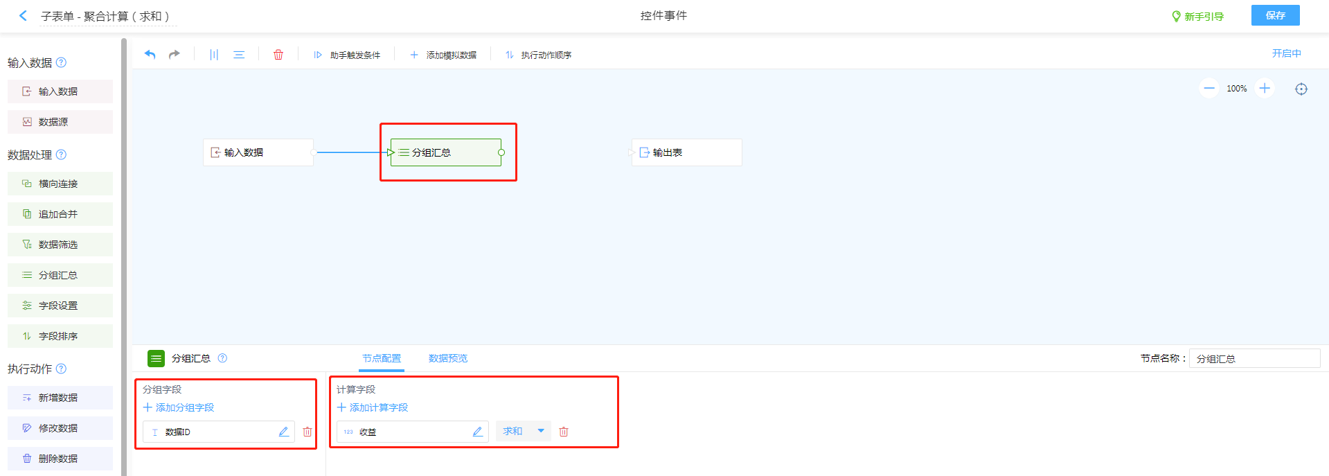 分组汇总,分组字段选择“数据ID”,右侧计算字段选择需要参与计算的子表单字段,设置计算方式为求和。
