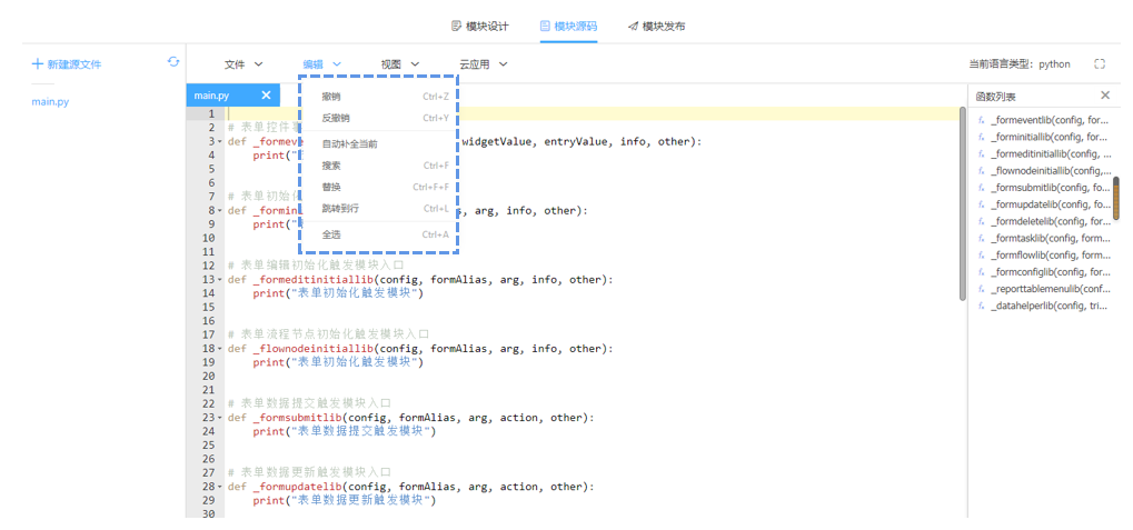 诚然,功能插件通过python封装而来,如果想进一步优化应用饰配汇也给与了代码在线编辑的权限。选中【插件源码】,编辑菜单中包含了一些常用功能并备注了快捷键,有代码基础的用户可以实现在线调试编辑代码。