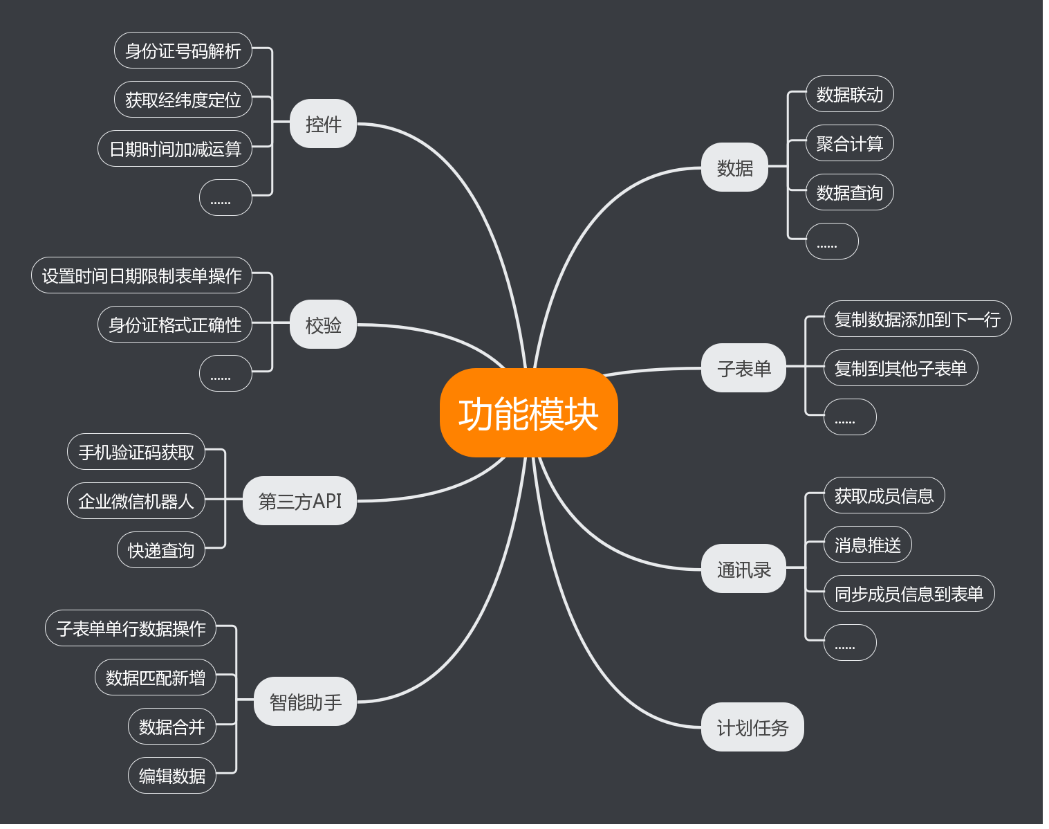 功能插件对于饰配汇基础功能的辅助升级体现在表单控件能力的扩展、复杂多表的复合计算、第三方对接等多个系统维度,应用场景丰富,能够全方位渗透式的为定制化业务场景服务。