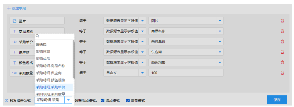 规则设置完成后,我们勾选【采购明细·采购单价】用于触发公式,在商品信息加载完成后,会自动进行采购单价的计算。勾选数据添加模式,便于追加和覆盖。