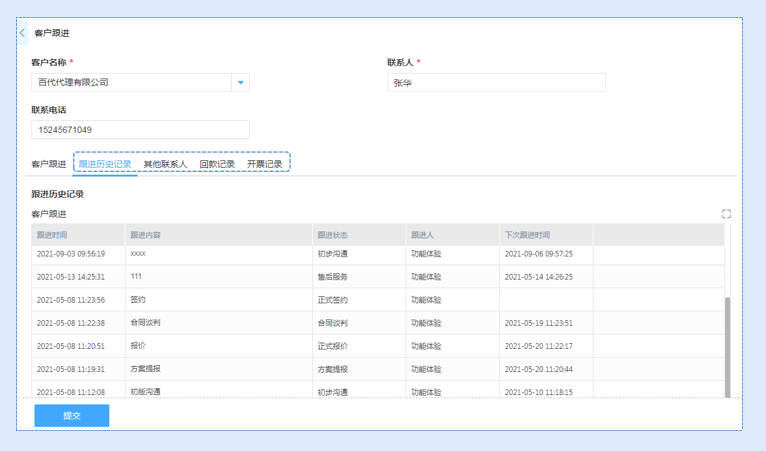 在客户关系管理系统中,客户跟进表单的记录,一般包含客户名称、联系人、联系电话、跟进方式、跟进状态等基本信息。当对接的客户数量多以及客户接触的时间较长时,很多节点进展业务人员不一定能完全知晓。