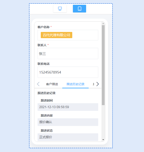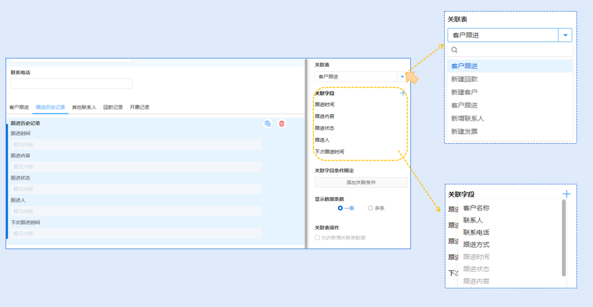 而在饰配汇,使用关联查询控件可以自动查询出其他表单中的一条或多条数据。例如常见的客户跟进环节,我们在表单页设置添加多个查询表单,能够方便业务人员更快速地获取与客户相关的跟进、回款、开户等动态。