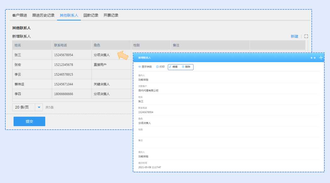 所有的设置编辑好保存后,我们就能方便地查询客户的历史跟进情况、与之相关的联系人、回款记录、开票记录等等。我们任意选择一家公司,与之相关的信息就能以列表的形式自动呈现。