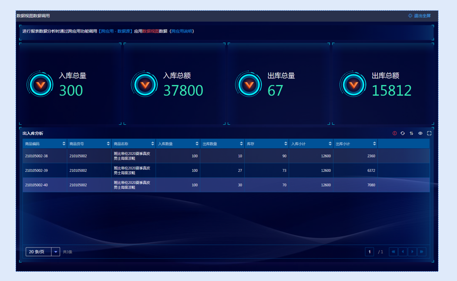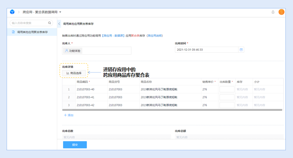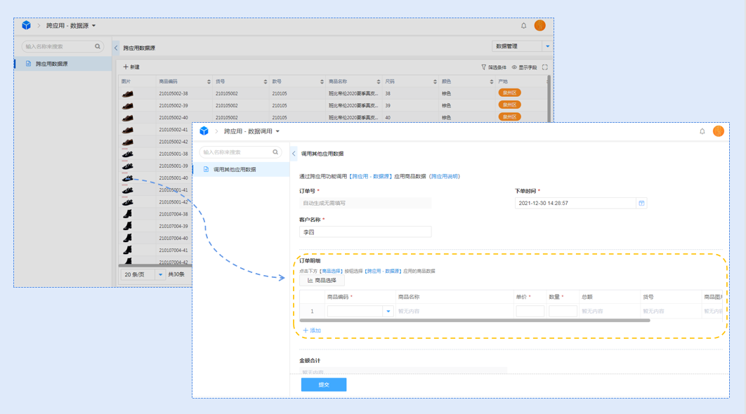 例如:在任意应用中调取进销存应用的跨应用聚合表数据信息。
