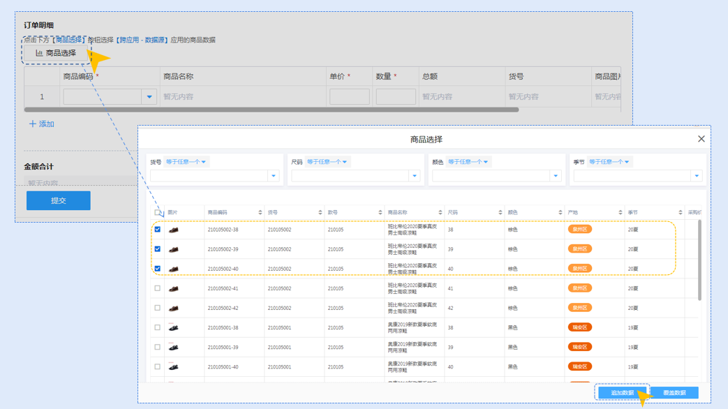 将订单明细的数据加载设置中,关联跨应用商品表单,就能实现跨应用调取商品详情信息,一键勾选完成下单。