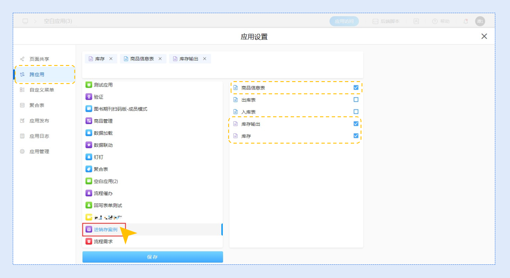 假设我们需要将进销存应用中的商品信息表、库存输出、库存表单设置为跨应用