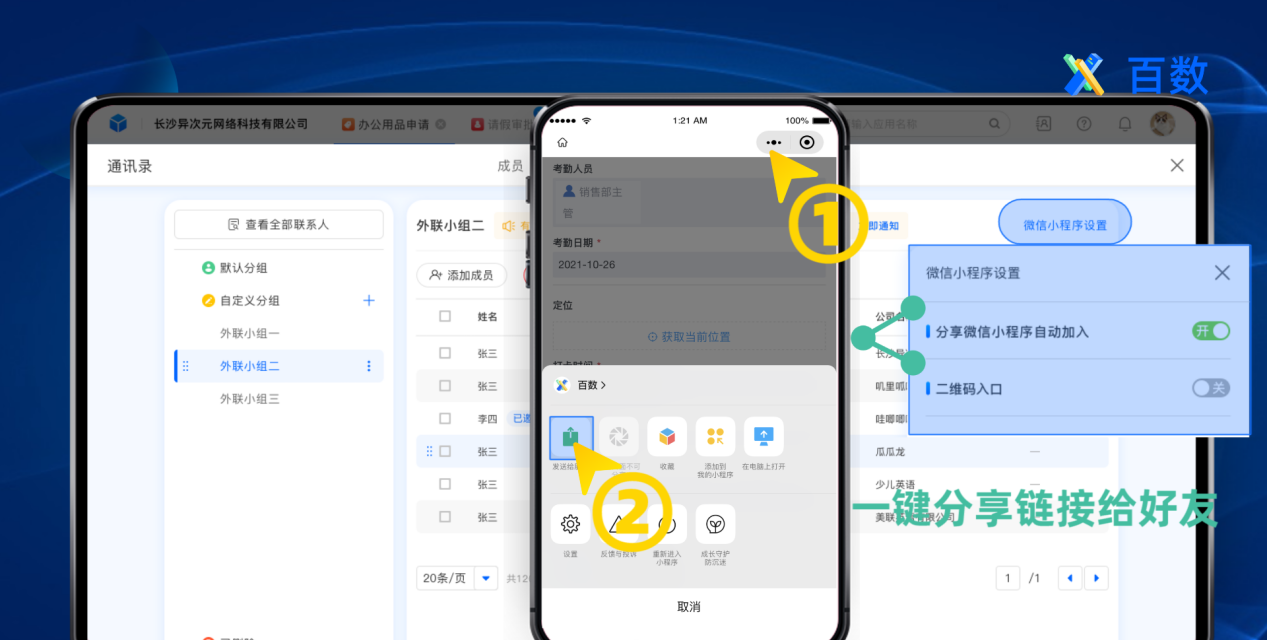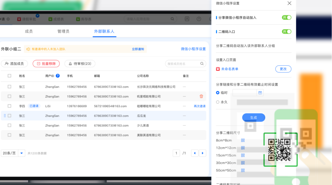 外部组织无需加入团队组织,点击分享链接后一键授权即可在线下单,也会同时拥有在小程序、浏览器、公众号内处理、查看、编辑相关权限业务数据的能力。