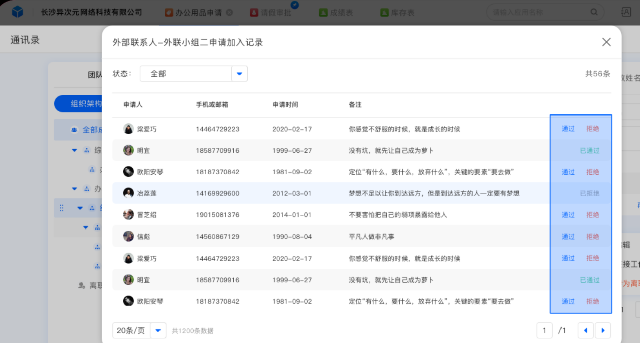 在企业通讯录中可以选择添加外部联系人并自由审核申请人员是否加入团队