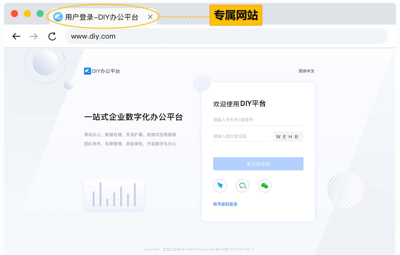 支持用户自由设计登录注册界面的文字展示板:[用户可在此处填入企业文化/企业通知..]以及系统欢迎语:[用户可在此处填入企业名称/slogan..],满足用户行业多样性与自由度;也可以根据需求,自主设置展示/隐藏文字展示版。