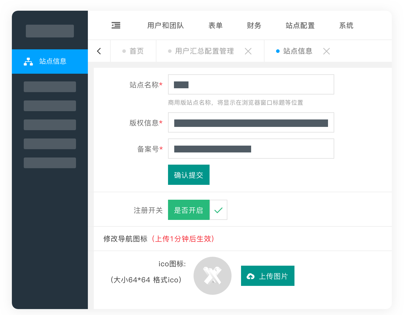 可以自主修改网站信息,包括站点名称、logo及备案等信息的管理,站点性能配置、站点监控、操作日志、更新日志等均可按照自己的需要进行自定义设置