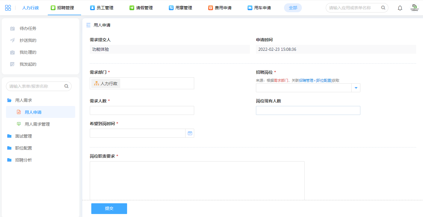 通过用人申请在线表单,直接将需求部门、招聘岗位、需求人数、到岗时间等详细要求填写发送到指定管理者审核,提高需求下达生效速度。