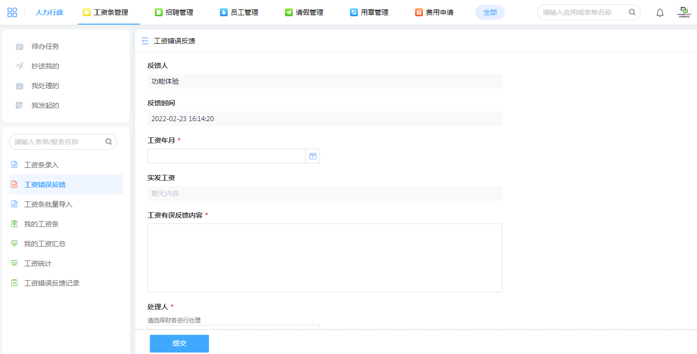 员工接收工资条后,对明细有疑问,可以填写工资错误反馈表单,提出疑问,选择相应的财务处理人。处理人接收到待办消息可以第一时间处理。