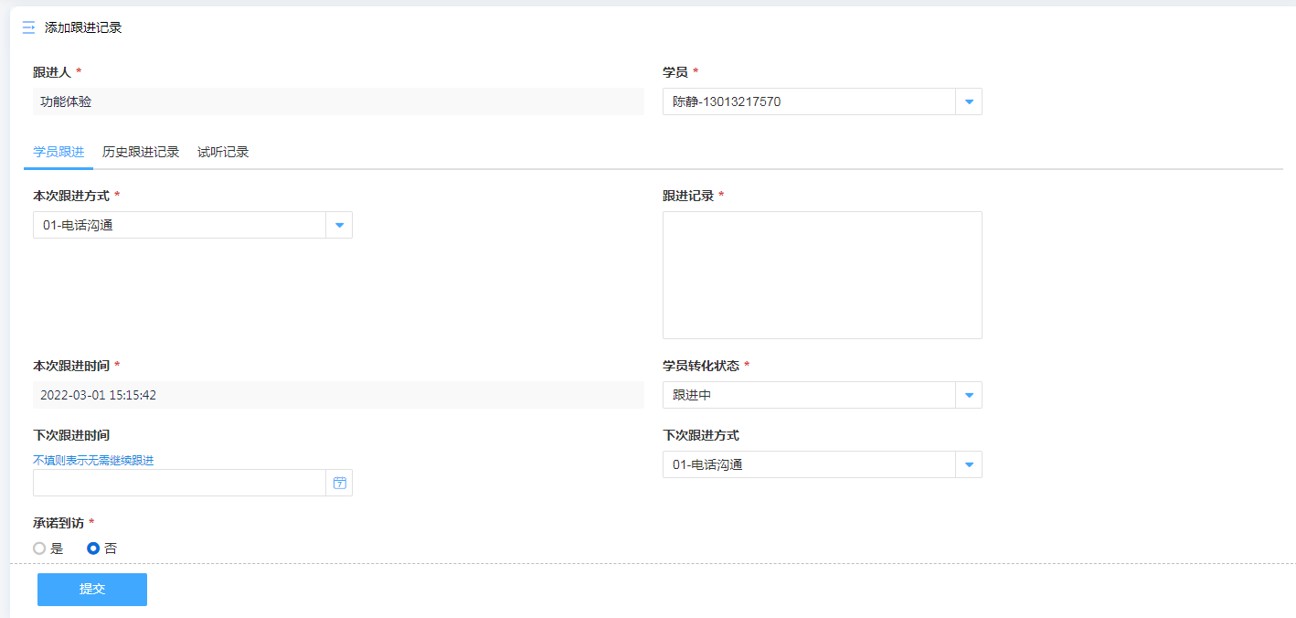 添加跟进记录表单可以设置子表单呈现历史跟进记录、试听记录等,方便快捷查看历史进展,方便招生老师把控学员转化进度。