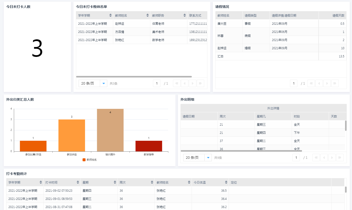 教师日常打卡、补卡、请假、外出等情况,可以采用数据视图功能进行汇总分析,生成的图表可以一键导出下载使用。