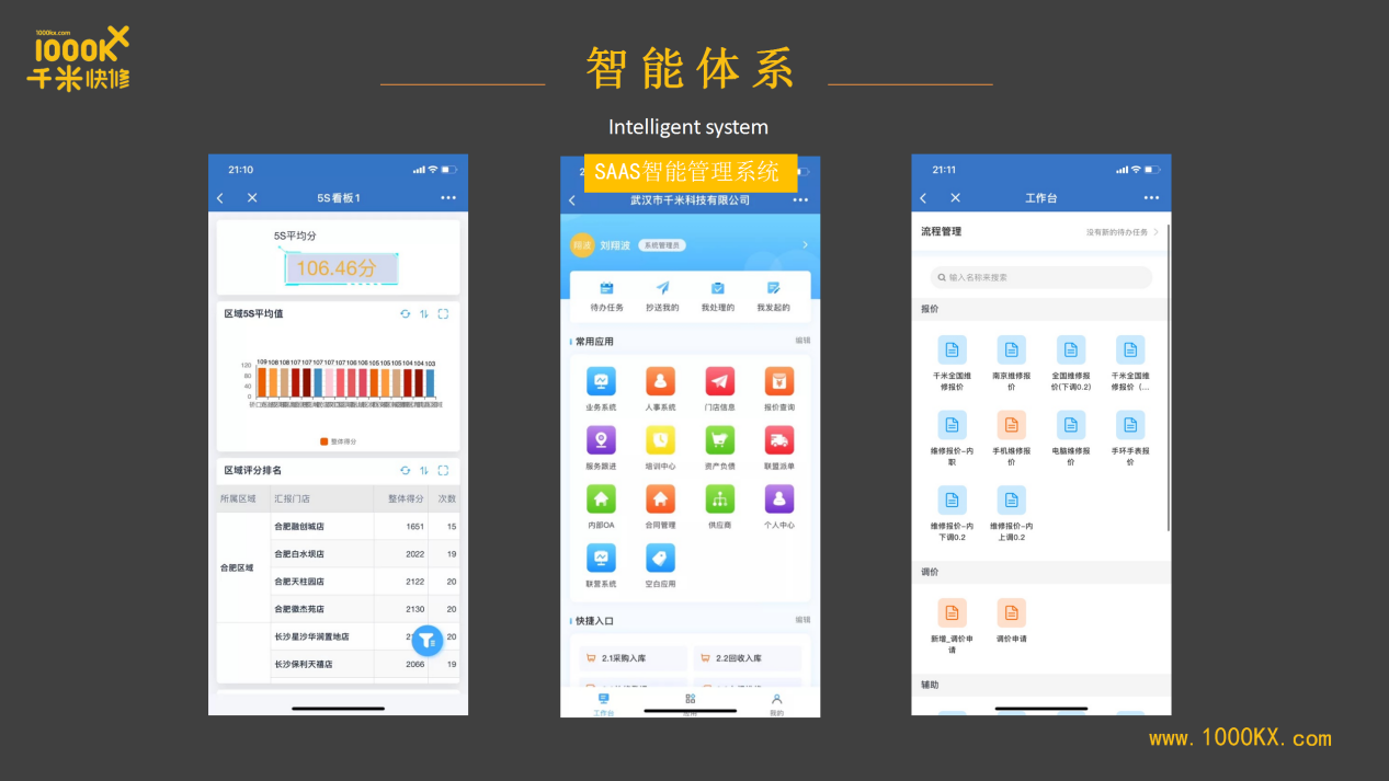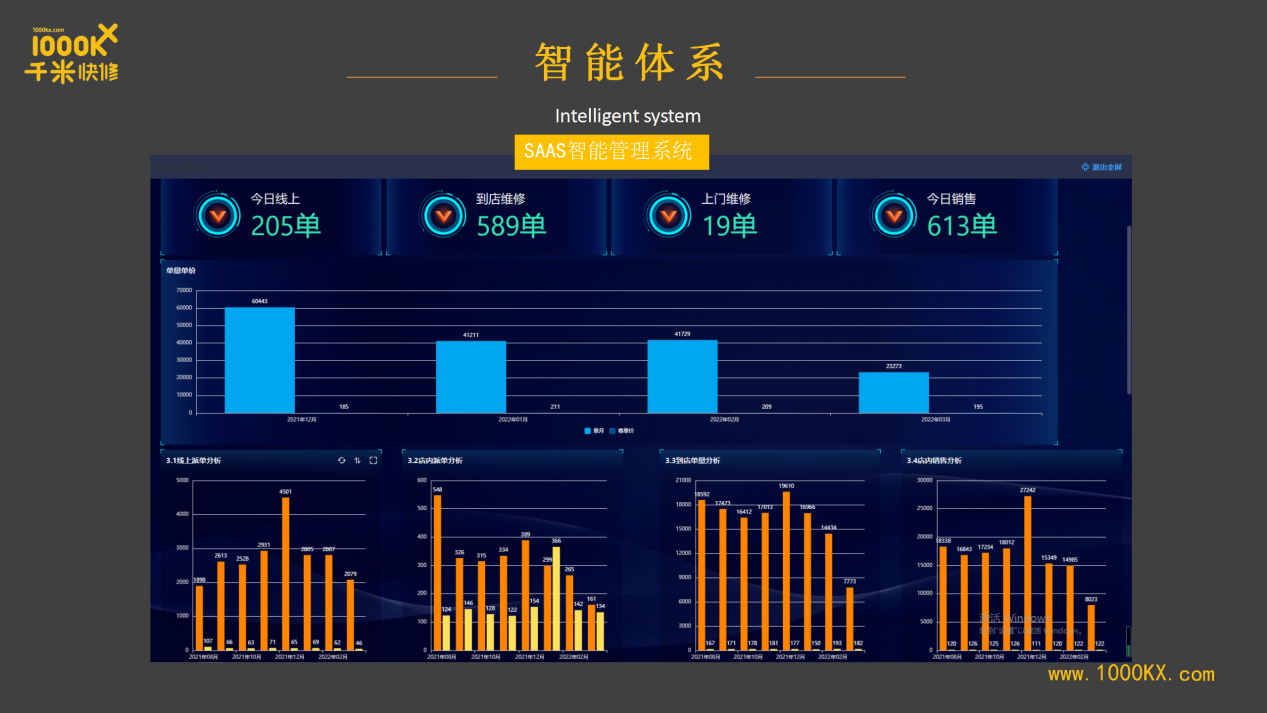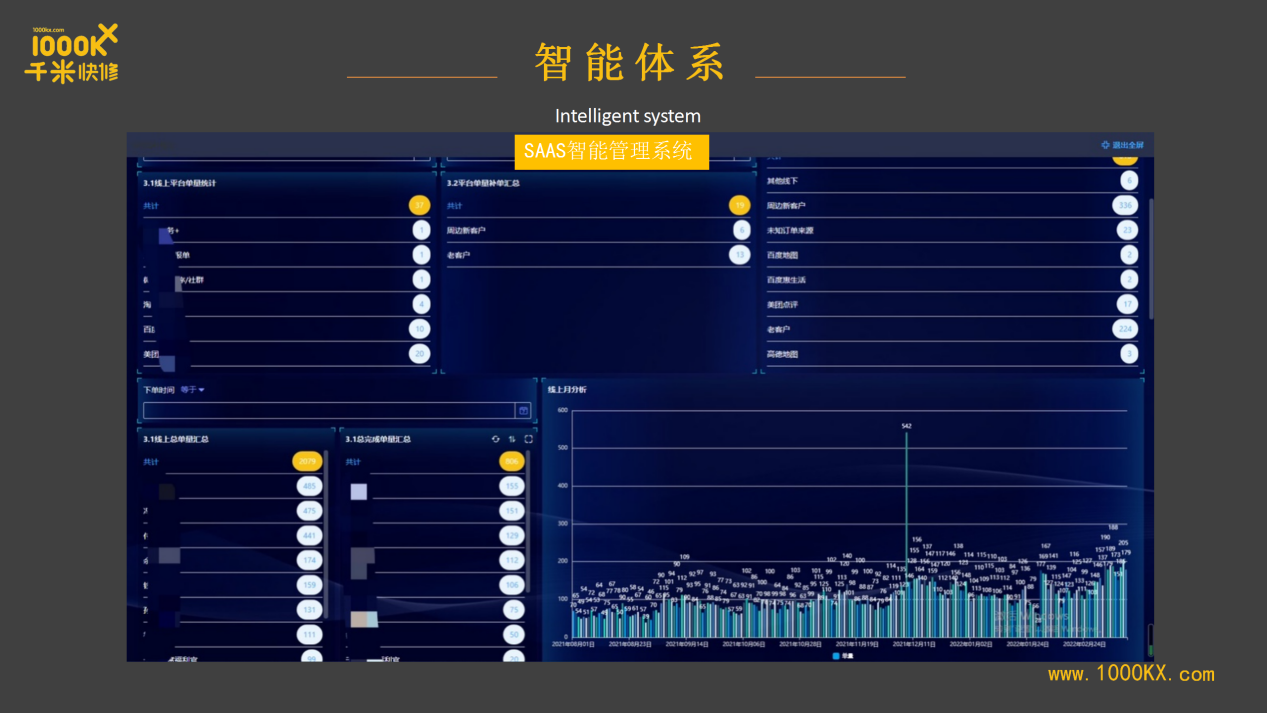 千米快修选择饰配汇搭建SaaS智能管理系统,从人、钱、事、物四个维度进行应用开发配置,实现包括门店员、财务、销售、库存等多板块智能管控。