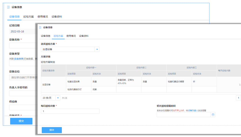 借助饰配汇子表单功能可以同时录入或调阅与设备信息相关的多个表单内容,例如切换巡检方案表单可以确认巡检指标,减少检查纰漏。