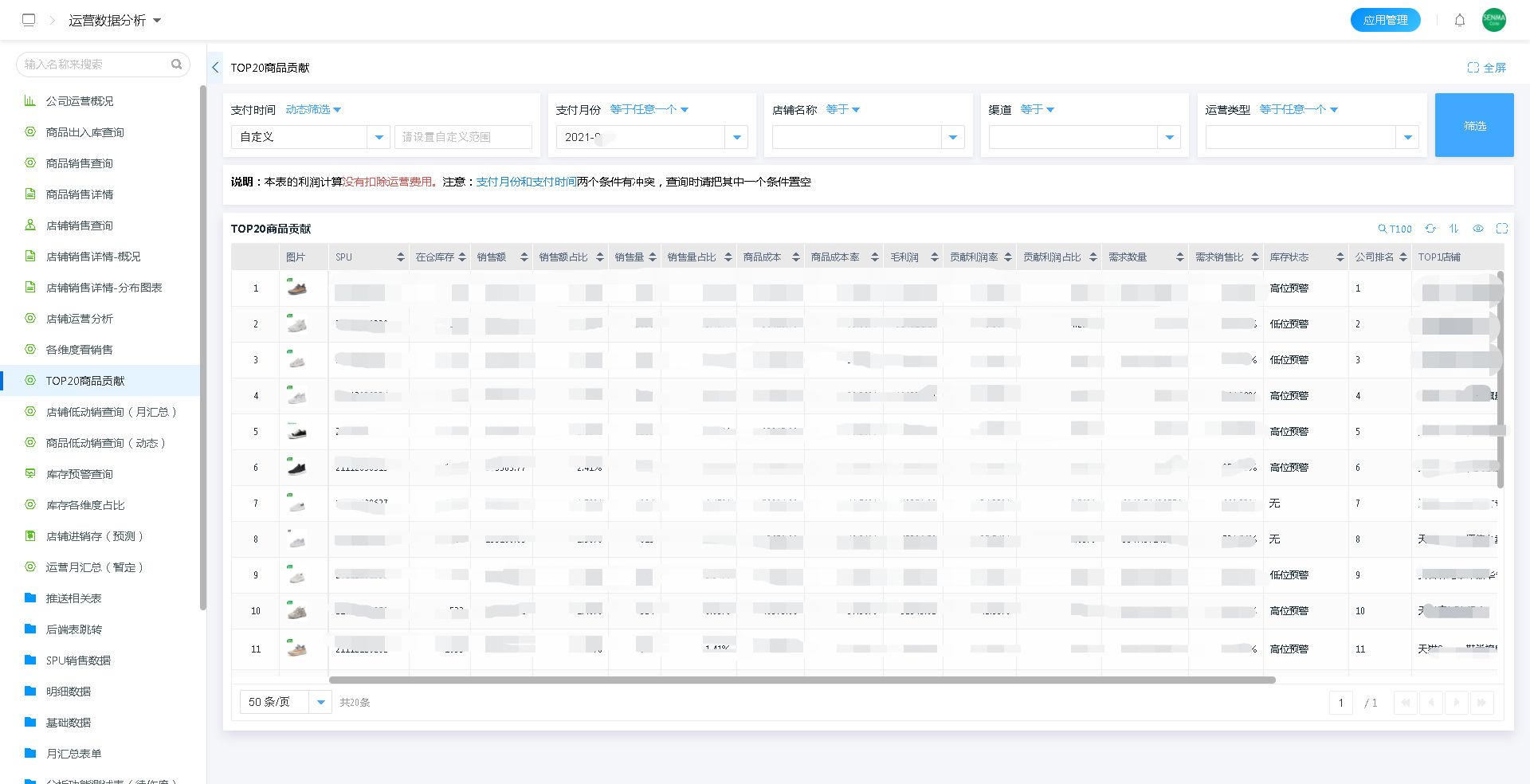 通过使用饰配汇平台对数据强大的计算能力,对商品销售数据进行分析,在千万基础数据中计算出TOP20商品贡献的商品,有助于企业在后续的运营、推广等环节针对性的做出正确的决策。
