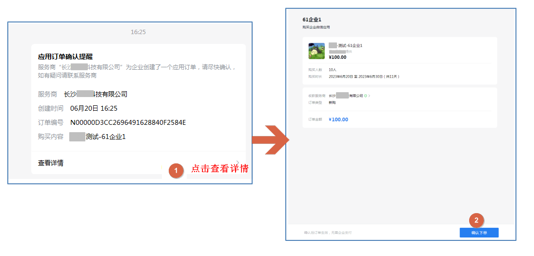 第二步:在企业微信端会收到一条下单信息,点入信息详情确认下单。