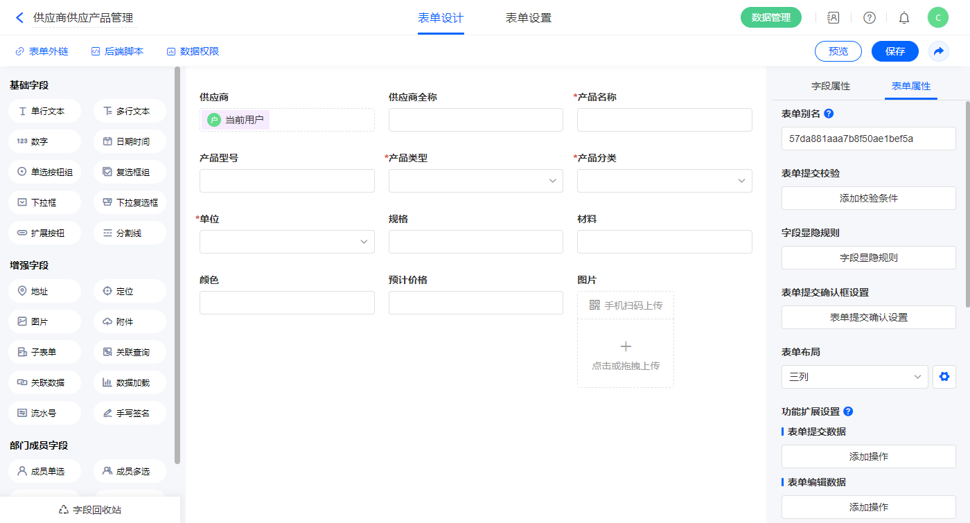 2.6、表单【供应商供应产品管理】字段及表单属性设置