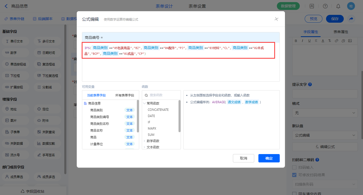 4)【商品编号】字段设置默认值为公式编辑,设置公式:“IFS(商品类别"05包装用品","BZ",商品类别"04配件","PJ",商品类别"03材料","CL",商品类别"02半成品","BCP",商品类别=="01成品","CP")”;
