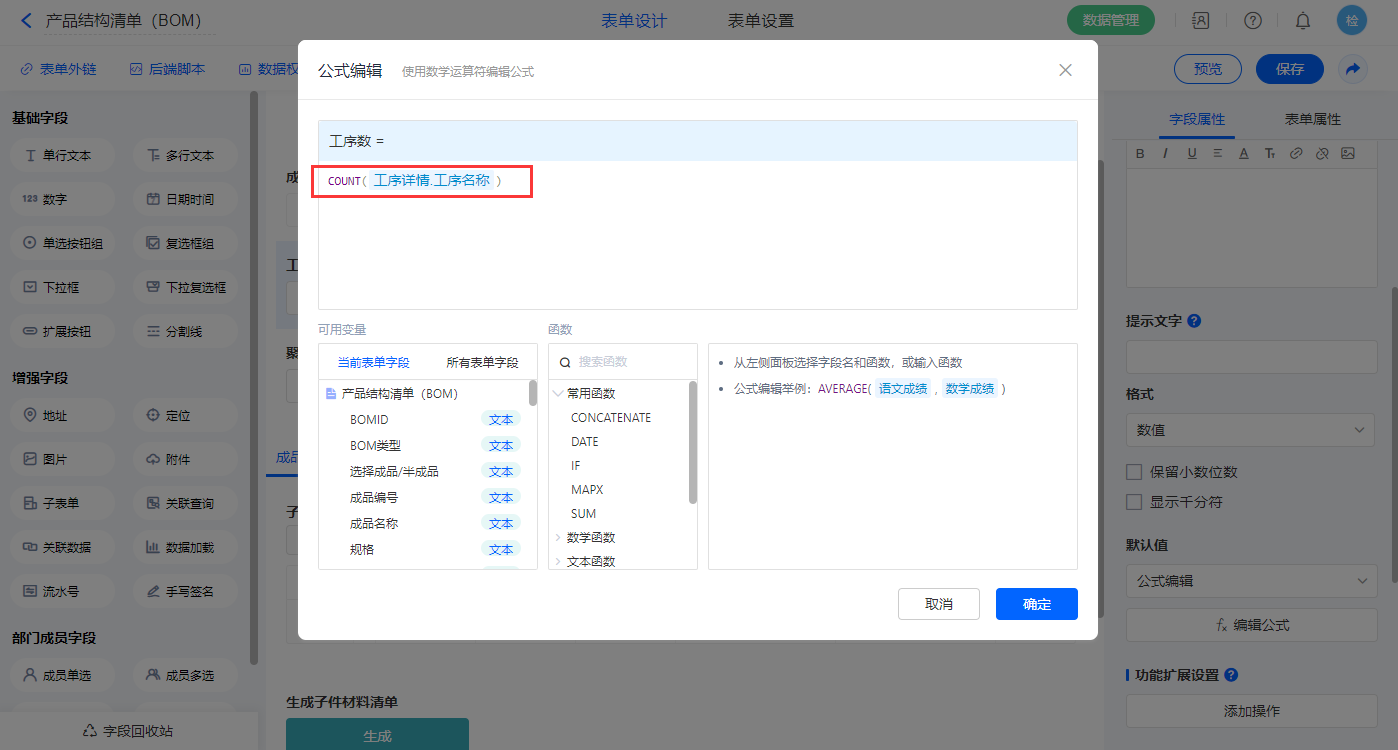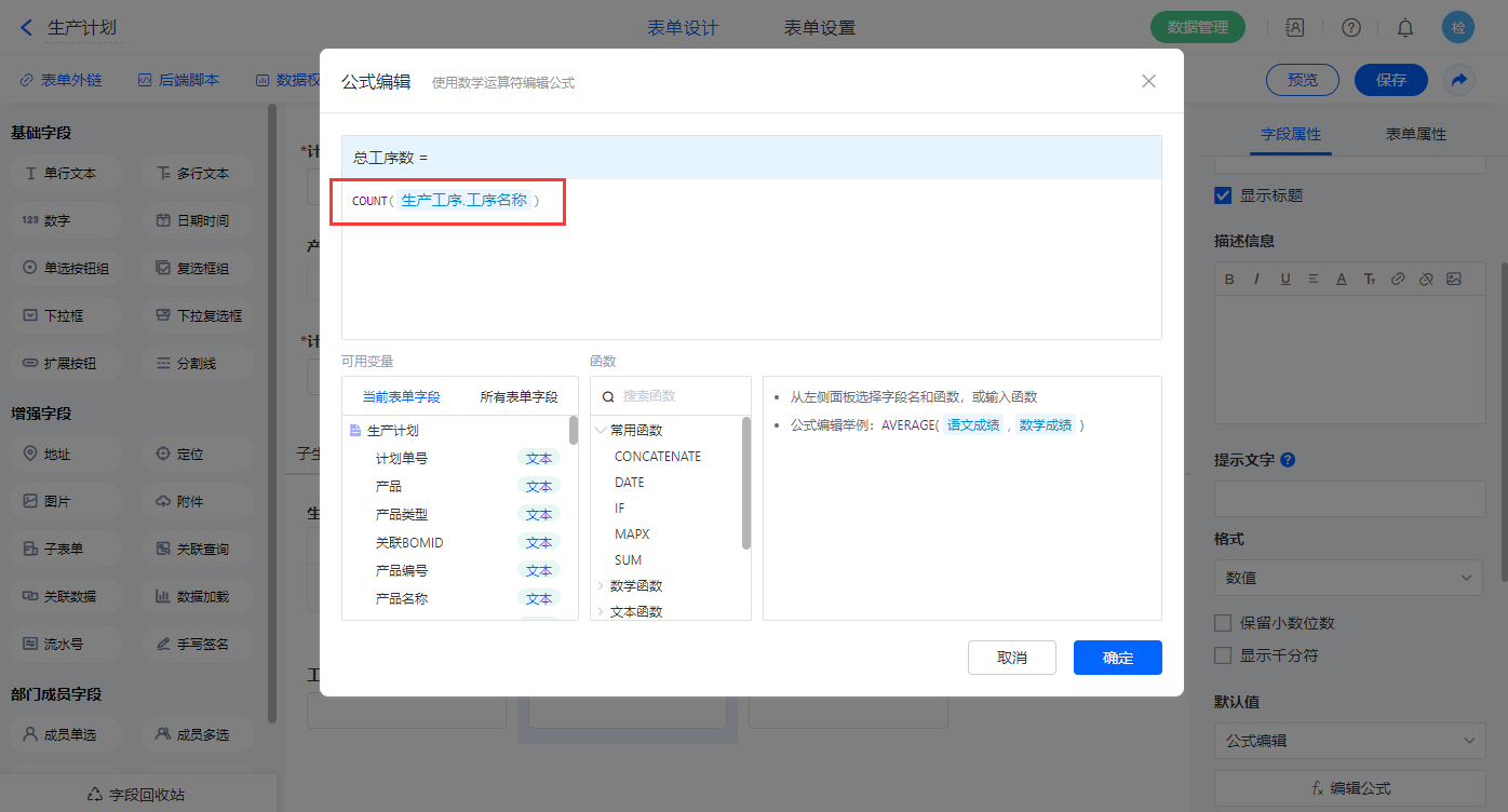 2)【工序数】字段,设置默认值为公式编辑,如图设置公式;