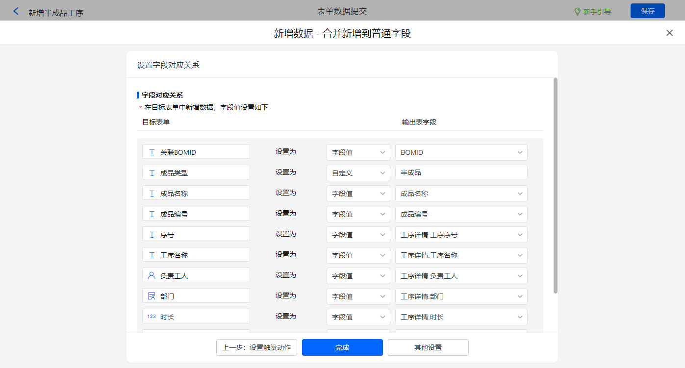 其他设置触发条件为【BOM类型】字段等于半成品,设置好点击【完成】并保存该数据助手;